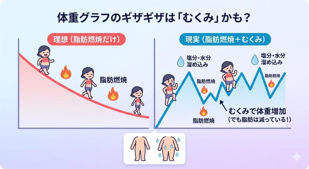 脂肪が減った分と同じだけの水分を体が抱え込んでしまえば、体重計の数字に変化は現れません。